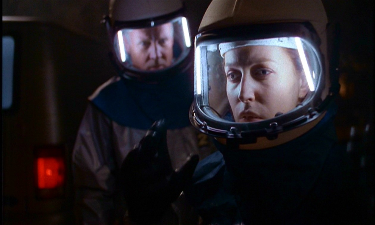 Back in the morgue, Dana inspects what’s left of Vicky’s head. Scully pokes and prods until she gets sprayed with blood and needs to be quarantined. Crump gets transported to the hospital, but his symptoms subside as the ambulance speeds up. So this might be more like Speed instead of The Chase; stay above 75 mph and his head won’t explode. Somehow, Patrick gets the jump on the trooper in the ambulance and takes Mulder hostage. Dana, not even aware Fox left the jail, calls to warn him Crump may be infected and Mulder should stay far, far away from him. Well that’s unlikely now…